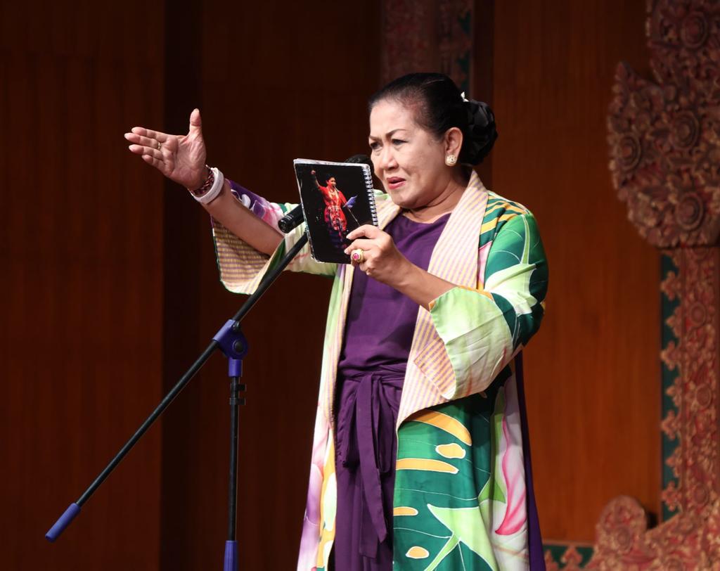 Ny. Putri Koster membacakan puisi ‘Sumpah Kumbakarna’ pada ajang FSBJ yang juga dihadiri Teater Keliling Jakarta, Selasa (18/7/2023). (Foto: Humas Pemprov. Bali)